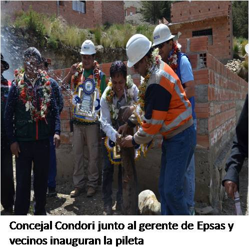 Para Teodora Laime, vecina del lugar, es una enorme alegría contar con agua a pocos pasos de su casa. “Todos los días debía bajar a traer agua y subir, y además es agua contaminada la de abajo. Estoy bien alegre, está bien que hay agua, estoy muy agradecida”, dijo. Por su parte, Ceferino López Cari, contó que luego de adquirir los terrenos el año 1984, las mismas familias trabajaron construyendo sus caminos y gestionaron desde entonces los servicios básicos, pero las autoridades municipales nunca les hicieron caso. “Revilla nos visitó y prometió muchas cosas, ahora no se asoma por aquí”, dijo. El concejal Donato Mario Condori recordó que el mandato del presidente Evo Morales Ayma es otorgar al 100% de todos los bolivianos el acceso al agua, porque es un derecho humano. Anunció que el proyecto Chuquiaguillo está avanzando y manifestó que en “2017 se inaugurará entre enero y febrero, y ustedes van a tener agua, para eso deben seguir unidos, hace poco hemos hecho una inspección con el Presidente. El Gobierno está invirtiendo 314 millones de bolivianos para que el proyecto de Chuquiaguillo sea una realidad”. Hugo Gómez, gerente general de Epsas, dijo que la empresa trata de romper las fronteras y la topografía accidentada de La Paz para llegar a diferentes lugares. Recordó que cuando Epsas era administrada por franceses, solo se contaba con 250 mil conexiones y “en la actualidad administramos 370 mil conexiones en La Paz, El Alto, municipio de Laja, Achocalla, Viacha, Mecapaca, Palca, siete municipios a los que llegamos con el servicio”, informó. Fiesta El contar con agua potable para el consumo humano generó una celebración especial entre los vecinos del lugar, en la que cada familia aportó con el preparado de alimentos que se compartieron en un apthapi enorme acompañado por una ch’alla previa a la Pachamama y a los inmensos tanques de agua que se encuentran en el lugar.