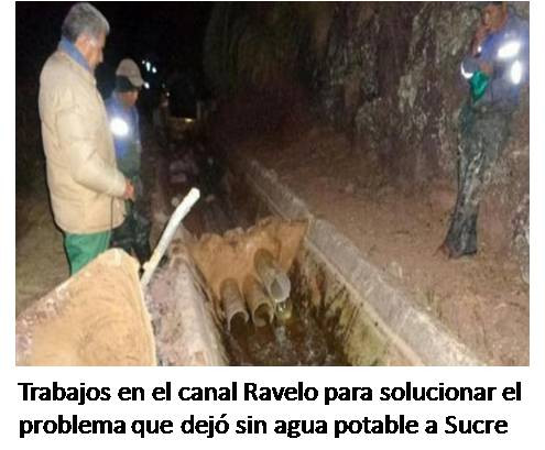 Horas críticas vivió la capital del Estado, Sucre, desde la tarde del miércoles cuando un sifonamiento en el canal Ravelo, que provee de agua a la ciudad, provocó un corte que afectó al 100% de la población. El problema fue solucionado parcialmente, pero aún cerca del 30% de la ciudad (que vive en zonas altas) no tiene suministro de agua potable, según señaló El gerente general de Empresa Local de Agua Potable y Alcantarillado Sucre (Elapas), Juan Carlos Vacaflor al diario Correo del Sur. Se espera que hasta el viernes se normalice la distribución, una vez que concluyan los trabajos en la zona afectada. El canal de aducción que transporta agua del río Ravelo sufrió un sifonamiento. Su antigüedad provoca constantes inconvenientes que hacen temer una crisis mayor y que se prolongue por más tiempo. Se necesita solución permanente Pero el panorama a futuro no es muy alentador. El gerente general de Empresa Local de Agua Potable y Alcantarillado Sucre (Elapas), Juan Carlos Vacaflor, dijo que el canal afectado corre riesgo constante. "Hemos anunciado desde el año pasado que ya la vejez de nuestro canal y las condiciones climáticas son difíciles y pedimos su comprensión", afirmó Vacaflor a radio La Plata. El gerente de Elapas pidió a las autoridades que se "pongan las pilas" para que esta situación no se repita hacia futuro.